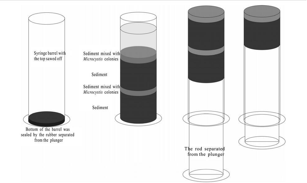 本實驗使用塑料注射器(50ml);注射器筒的頂部被切斷,底部用橡膠柱塞密封(圖1)。沉淀物、藻類和過濾水被一層一層地添加到桶中。首先,添加15毫升沉積物作為初始層。添加沉淀物和菌落微囊藻(3 mL)的混合物作為第二層。第三層和第四層分別與第一層和第二層相同。接下來,將0.5g凍干沉淀物均勻地灑在第四層上。最后,緩慢添加10毫升過濾后的湖水作為第五層,以模擬沉積物和微囊藻的再懸浮。注射器筒的外部覆蓋著錫箔,頂部覆蓋著透氣膜。為了比較有毒銅綠假單胞菌和無毒威森伯格假單胞菌的存活能力,將這些裝置分為三組,并添加了各種藻類。第一組中添加銅綠微囊藻,第二組中添加魏森伯格微囊藻。在第三組中,將等量的綠膿桿菌和威森貝格氏桿菌混合并添加到桶中(稱為微囊藻屬)。三組微囊藻菌落的細胞密度均為2.3×108±1.2×107。將微宇宙(圖1)置于培養箱中,并在三種不同溫度(5、15和25°C)下保持在黑暗中。