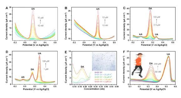 要點4.NB-GF Co-N-CNTAs微電極的結構特性、高催化活性和良好的生物相容性為多通道、微流控檢測氧化還原活性生物分子(硫化氫(H2S)、多巴胺(DA)、尿酸(UA)和抗壞血酸(AA))提供了機會。