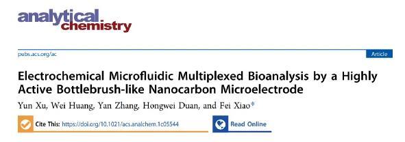 相關工作以“Electrochemical Microfluidic Multiplexed Bioanalysis by a Highly Active Bottlebrush-like Nanocarbon Microelectrode”為題發表在Analytical Chemistry上。