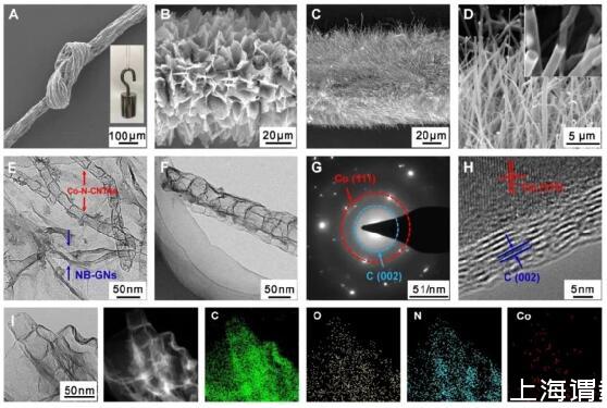 圖2.(A)NB-GF和(B)NB-GF Co-N-CNSs和(C,D)NB-GF Co-N-CNTAs的SEM。(E)NB-GF Co-N-CNTAs和(F)Co-N-CNT的TEM和(G)對應的SAED。(H)Co-N-CNT中螯合界面的HRTEM。(I)Co-N-CNTs的TEM、STEM和相應的EDS元素分布。