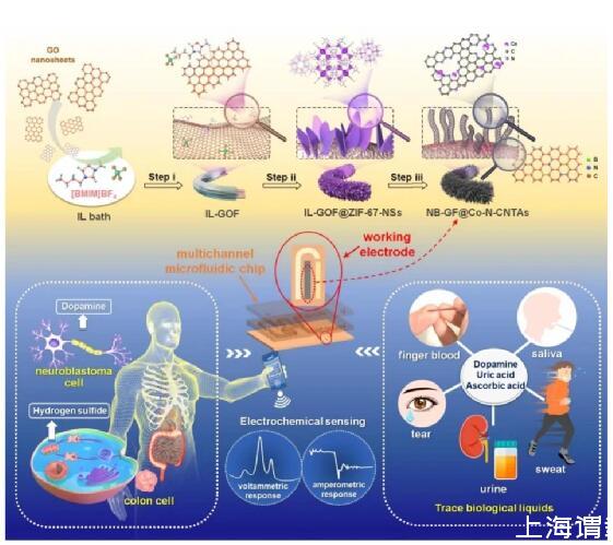 圖1.NB-GF Co-N-CNTAs微電極制備示意圖(步驟i:用離子液體(IL)浴將氧化石墨烯納米片(GO NSs)紡成氧化石墨烯纖維(GOF);步驟ii:ZIF-67-NSs在GOF上生長;步驟iii:熱解),通過集成電化學傳感器的自制多通道微流控芯片,以NB-GF Co-N-CNTAs為工作電極,檢測人類結腸細胞、神經母細胞瘤細胞以及微量生物液體中的生物分子誘導信號。
