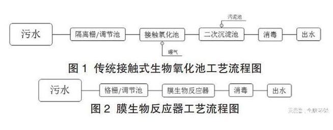 膜生物處理技術主要包括膜分離裝置、曝氣裝置、萃取反應器。其中膜分離反應器因其獨特的生物特征,成為最廣泛應用的裝置。在實際污水處理運行的過程中,根據生物膜在反應器中的位置,可以將膜生物反應器分為不同的類型,包括一體式類型、分離式類型等。除此之外,厭氧反應器及好氧反應器都可以運用到污水處理程序中。膜生物反應工藝與傳統污水處理工藝比較如圖1~2。