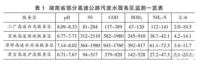 (2)污水以餐廚污水與公廁清洗污水為主,COD、BOD、SS、油類、氮、磷含量較高,受其產生量的影響,高速公路特征污染物濃度變化范圍較大,詳見表1。
