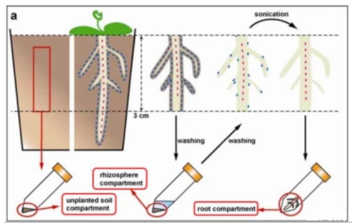 b.晃動根部,去除根部松散的土壤后,使用無菌刷子從根部收集殘留土壤;