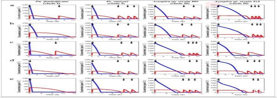 圖2、2015年5月11日至7月14日期間,工藝水溫度和測量的水相中的N 2 O濃度。圖中顯示了在工藝水中測得的N2O濃度和溫度。在某些時期(陰影區域),水傳感器被放置在處理線的非曝氣區域內,并且在這些時期,N2O的測量值接近于零,具有正讀數和負讀數。由于這些非常低的濃度還涉及正確讀數的高不確定性,因此評估中排除了這些數據點。在非曝氣區測量的主要結果是沒有形成大量的N2O,并且由于沒有進行曝氣,可能形成的N2O沒有被汽提而是留在水中。N2O在這些區域中可能形成的要么在水通過曝氣區時排放到廢氣中,要么隨流出物一起排放,并可能在污水處理廠的后期排放。。
