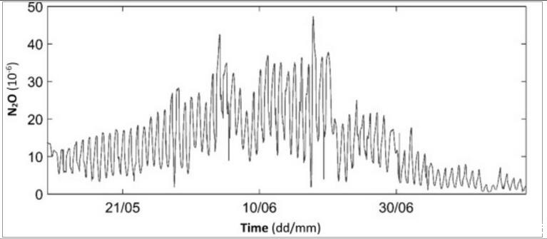 圖1、2015年5月11日至7月14日期間,在K?ppala污水處理廠BB11區的通風空氣中測得的一氧化二氮(N 2 O)濃度。