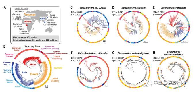 先前的研究表明,腸道細菌譜系的一小部分與原始人類祖先一起形成了物種,但這種共同多樣化模式是否在人類宿主中擴展還有待證實。自從人類走出非洲后,人口在全球范圍內不斷增長。飲食和生活方式也隨著時間推移發生了巨大的變化。然而,特定的腸道細菌菌種不但沒有消失,而且已經與人類“同呼吸,共命運”。因此,識別與人類共存的菌種對于理解腸道細菌如何隨著其人類宿主的共同進化,以及兩者之間的相互作用具有重要意義。 在這項新研究中,該團隊首次系統地比較了人類與其腸道微生物的進化史。他們為來自加蓬、越南和德國的1225名母子參與者(839名母親和386名兒童)及其腸道中發現的59個微生物分類群創建了系統發育樹,以評估人類種群之間和種群內共享的腸道細菌菌種之間的共同多樣化,并使用統計測試來調查這些發育樹的匹配程度。