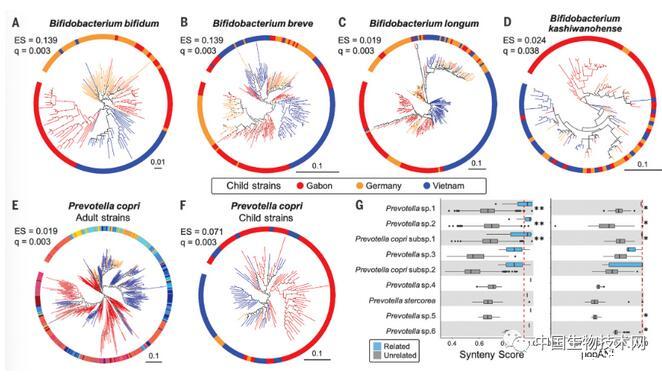 一些腸道細菌的行為就像它們是人類基因組的一部分,正處在從“自由的活細菌’到依賴人體環境的梯度上,它們顯示出似乎已經獲得了對宿主不可逆的依賴性。這從根本上改變了我們對人類腸道菌群的看法。 隨后,研究人員對兒童參與者(平均年齡7.4個月)的腸道宏基因組進行了采樣。與其母親的數據結合分析,讓他們有了一個前所未有的機會來測試兒童腸道菌群的共同多樣化模式。在測試的20個最常見的兒童分類群中,有9個顯示出共同多樣化的證據。其中, 長雙歧桿菌顯示出最有力的共同多樣化 。幾個分類群的協同多樣化信號在加蓬和德國的兒童中得到擴展,但在越南兒童參與者中沒有被發現。這些結果表明 ,生命早期腸道常見的細菌也與人類共同多樣化。
