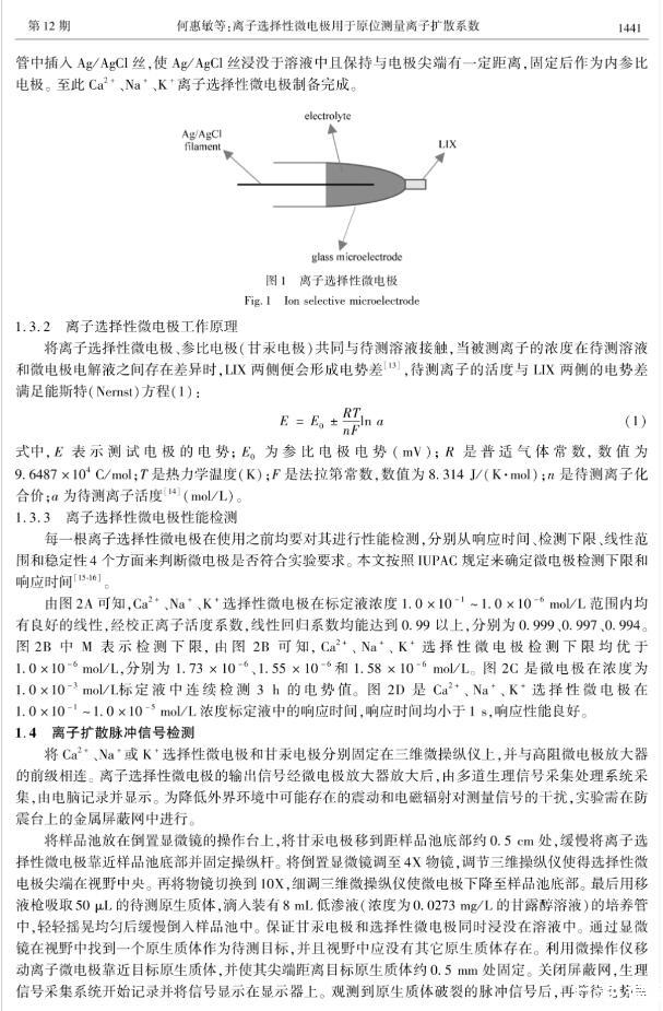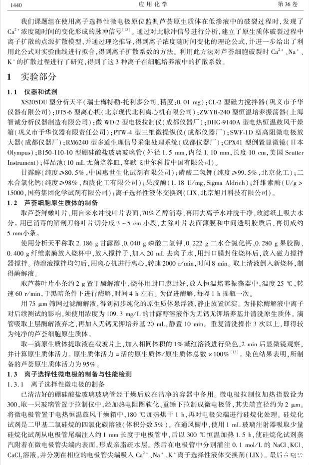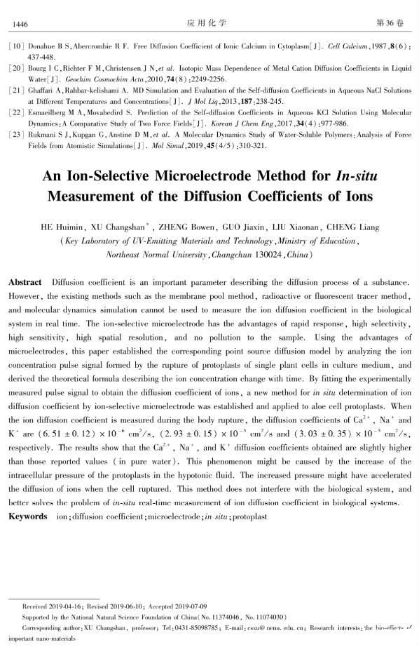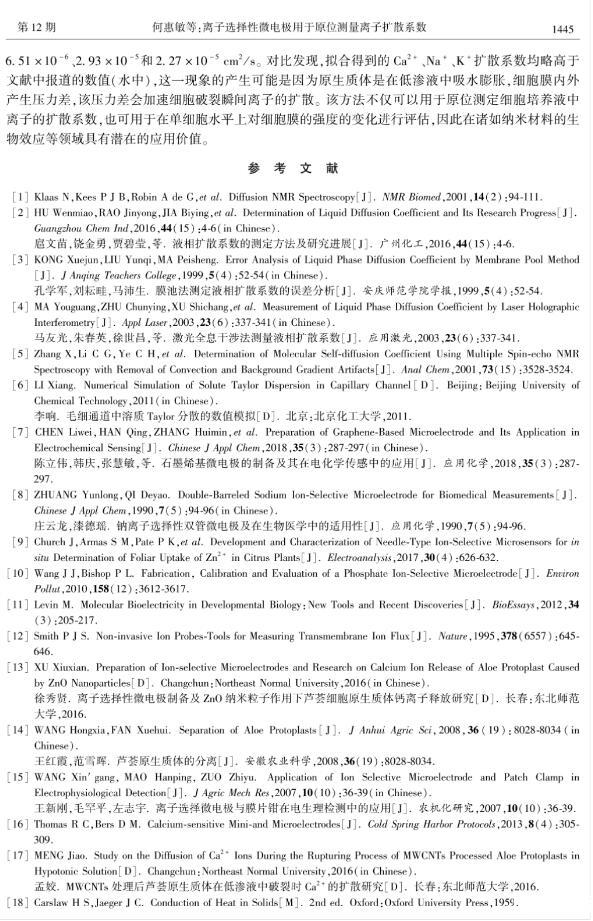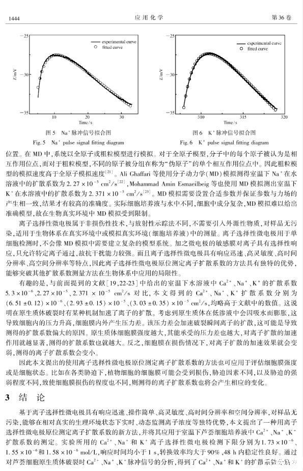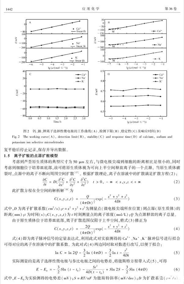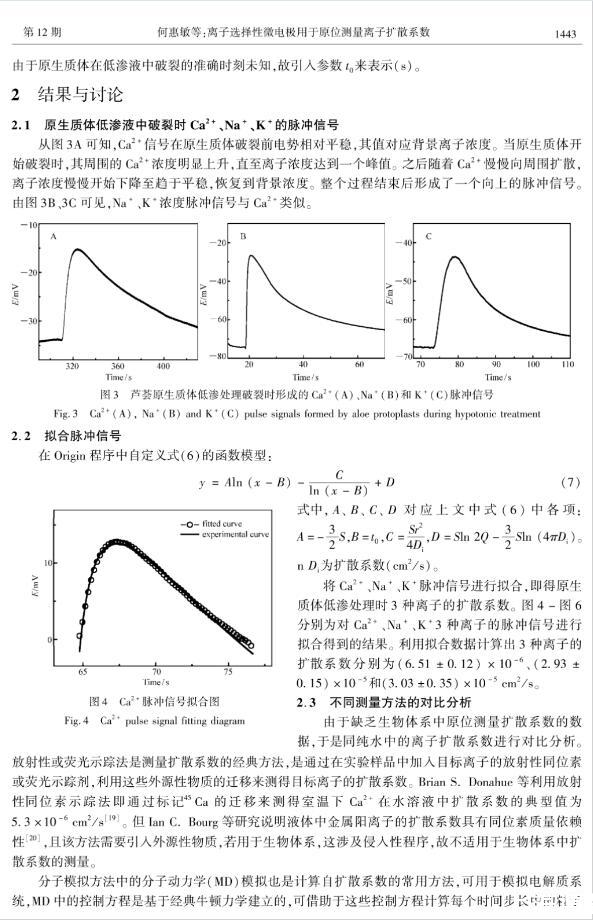 擴散系數是描述物質擴散過程的重要參數,而用膜池法、放射性或熒光示蹤法、分子動力學模擬等現有方法無法原位進行生物體系中離子擴散系數的實時測量。本文利用離子選擇性微電極響應迅速、高選擇性、高靈敏度、高空間分辨率、對樣品無污染等優勢,通過分析單個植物細胞原生質體在培養液中破裂時所形成的離子濃度脈沖信號,建立了相應的點源擴散模型,推導出了描述離子濃度隨時間變化的理論公式,并通過該公式對實驗測得的脈沖信號進行擬合,得到了離子的擴散系數,從而建立了一種用離子選擇性微電極原位測定離子擴散系數的新方法,并將其應用于蘆薈細胞原生質體破裂時離子擴散系數的測定,得到了Ca~(2+)、Na~+和K~+的擴散系數分別為(6.51±0.12)×10-6、(2.93±0.15)×10-5和(3.03±0.35)×10-5cm2/s。對比發現,擬合得到的Ca~(2+)、Na~+和K~+擴散系數均略高于已報道的數值(純水中),這一現象的產生可能是因為原生質體是在低滲液中吸水膨脹,細胞膜內壓力升高產生內外壓力差,該壓力差會加速細胞破裂時離子的擴散。這一方法對生物體系無干擾,較好地解決了生物體系中離子擴散系數原位實時測量的難題。