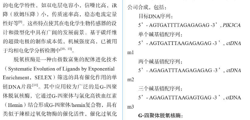 【摘要】:特定序列核酸的檢測在臨床病原體檢測、癌癥早期診斷以及遺傳病確診等方面至關重要。無標記均相電化學傳感器在低消耗、低成本、易操作、快速檢測和高重復性等方面具有顯著的優勢。我們基于復合功能核酸分子和超微電極檢測裝置,構建了無標記均相電化學核酸傳感器,用于PIK3CA循環腫瘤DNA(ctDNA)的高特異性檢測。將PIK3CA ctDNA互補序列和G-四聚體脫氧核酶偶聯,分別作為目標識別元件和信號轉換元件,設計了具有莖環結構的單鏈DNA,其中G-四聚體和ctDNA互補序列通過堿基互補被封閉。當目標DNA即PIK3CA與其互補序列特異性結合后會導致DNA構象變化,釋放G-四聚體并發揮過氧化物酶的活性,催化H2O2和對苯二酚(HQ)反應,產生對苯醌(BQ)和水。使用碳纖維超微電極微型電化學裝置對微升體積樣本中HQ和BQ的氧化還原電流信號進行檢測。結果表明:氧化還原電流信號隨目標DNA分子濃度變化而變化,檢測限達20 nM,可有效區分完全互補序列和單堿基錯配序列DNA。此外,在血清摻雜樣本中該傳感器表現出類似的檢測效果。本研究設計的電化學生物傳感器實現了微升體積內ctDNA的高性能檢測,為特定病原體或腫瘤基因的靶向DNA序列檢測提供了一種新思路,在醫學診斷和便攜式檢測中具有廣闊的應用前景。