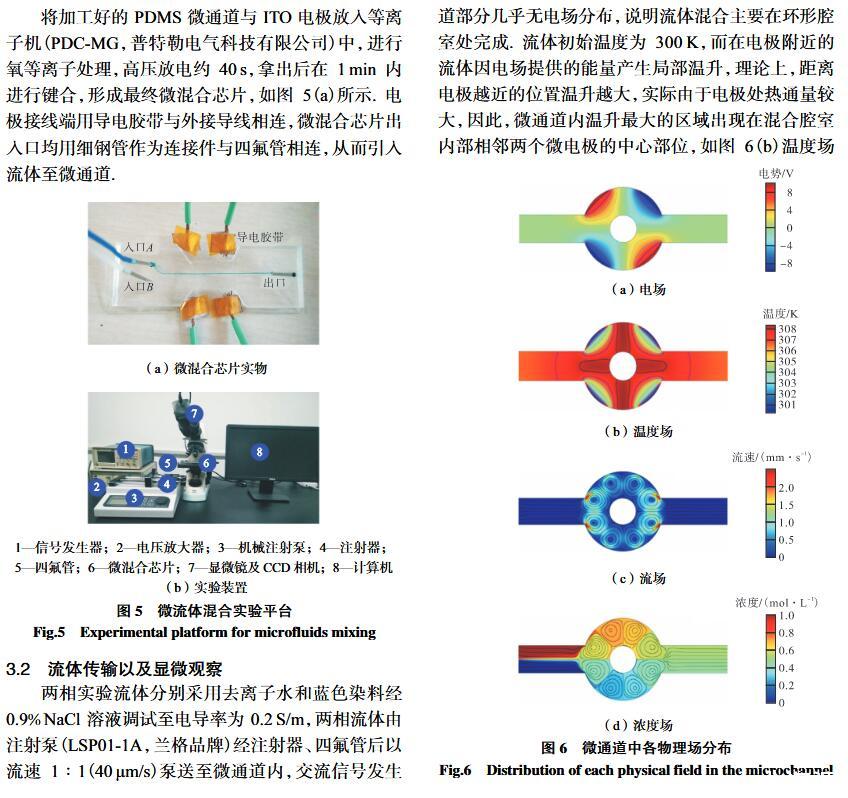 【摘要】:微流體交流電熱效應混合是縮短藥物篩選時間的有效手段之一。混合機制通常由微電極誘導流體內部產生溫度梯度,從而形成渦流用于整個樣品區域內的流體攪拌.但生物流體電導率偏高,交流電熱的溫升容易影響藥物活性。因此,設計并封裝一款環形微流體混合芯片,在不損失混合效率的前提下抑制流體的溫升,揭示該芯片的混合性能,數值模擬與實驗對微通道內兩相流體的動態混合過程進行定量分析,并對模型幾何參數、物理參數等條件進行優化研究.首先,利用Comsol仿真軟件進行電場、溫度場、流場以及稀物質傳輸場的強耦合仿真計算,以混合效率為目標函數,同時以溫升上限作為約束條件,優化電壓幅值以及微電極陣列的尺寸和分布。仿真結果表明,在給定電壓下弧形微電極陣列的分布模式以及尺寸大小是影響混合效率的主要因素,電極對稱/非對稱分布誘導不同形式的非勻強電場空間分布,電極尺寸直接影響電場對流體的作用力范圍。綜合溫升研究,仿真最優混合效率可達98.67%。然后,以優化的電極尺寸參數加工氧化煙錫微電極陣列,軟光刻加工聚二甲基硅氧烷微通道。將上述帶有特定微通道圖案的PDMS與微電極玻璃基底封裝后形成最終的微混合實驗芯片。最后,使用電導率為0.2 S/m的藍色染料溶液和去離子水緩沖液(經0.9%NaCl溶液調節電導率值)進行混合實驗,微混合器混合效率可達93.16%。