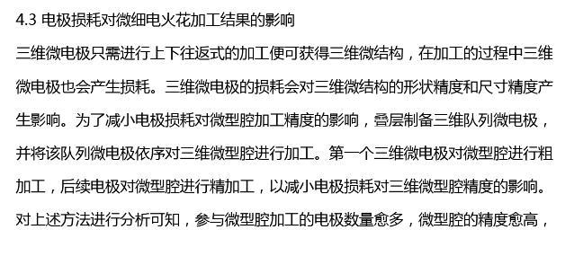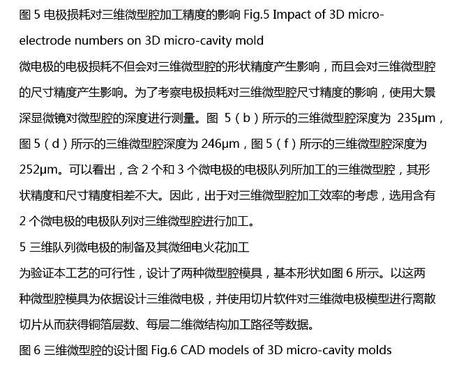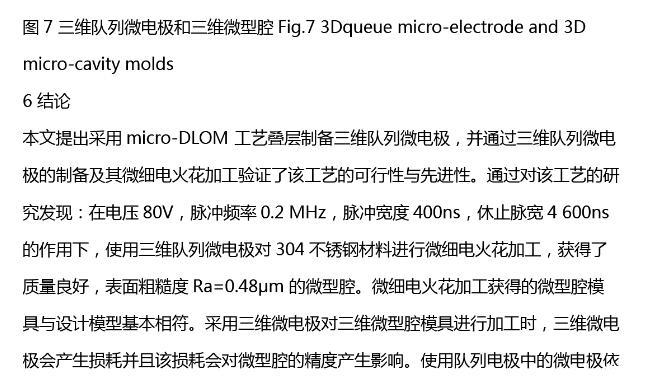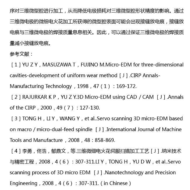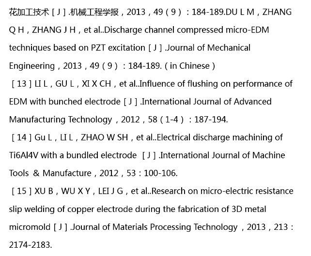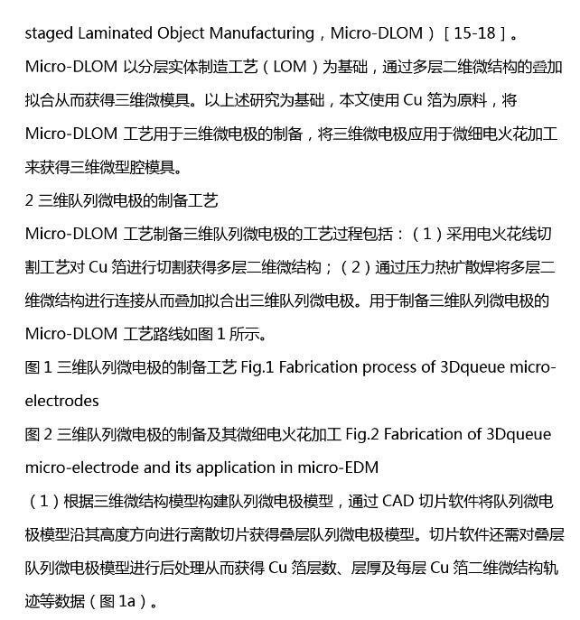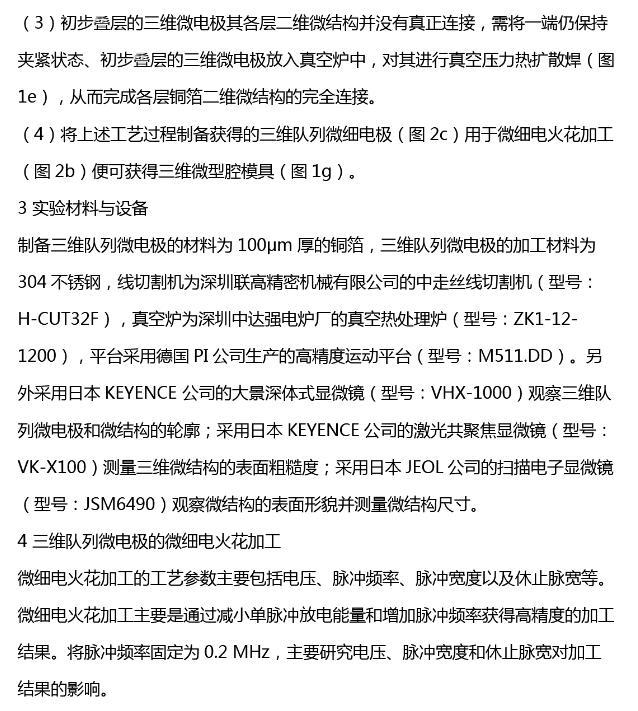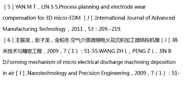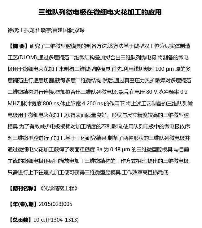 【摘要】:研究了三維微型腔模具的制備方法。該方法基于微型雙工位分層實體制造工藝(DLOM),通過多層銅箔二維微結構疊加擬合出三維隊列微電極,將制備的微電極用于微細電火花加工來制得三維微型腔模具。首先,利用線切割對100μm厚的多層銅箔進行逐層切割,獲得多層二維微結構。然后,通過真空壓力熱擴散焊對多層銅箔二維微結構進行連接,疊加擬合出三維隊列微電極。最后,在電壓80V,脈沖頻率0.2MHZ,脈沖寬度800ns,休止脈寬4 200ns的作用下,將上述工藝制備的三維隊列微電極用于微細電火花加工,獲得表面質量良好、形狀與尺寸精度較高的三維微型腔模具。為了有效減少電極損耗對加工精度的不利影響,使用隊列電極中的微電極依序對三維微型腔進行了加工。基于上述研究結果,制備了兩種形狀的三維隊列微電極并通過微細電火花加工獲得了表面粗糙度Ra為0.48μm的三維微型腔模具。與目前主流的微細電極逐層掃描放電加工三維微結構的工作方式相比,提出的三維微電極只需進行上下往返式加工便可獲得三維微型腔模具,工作效率高且損耗低。
