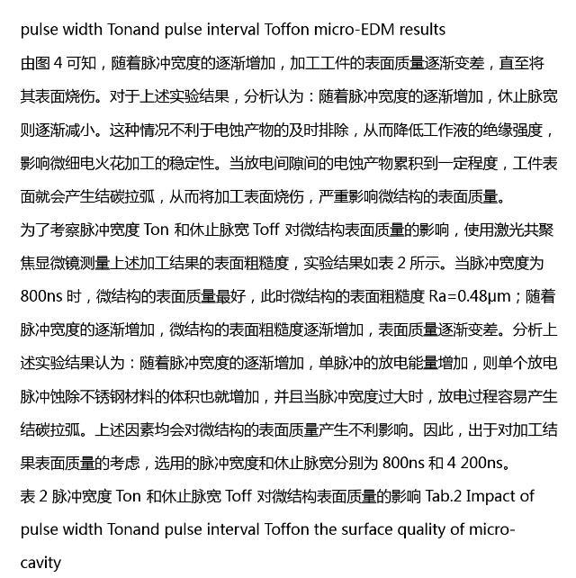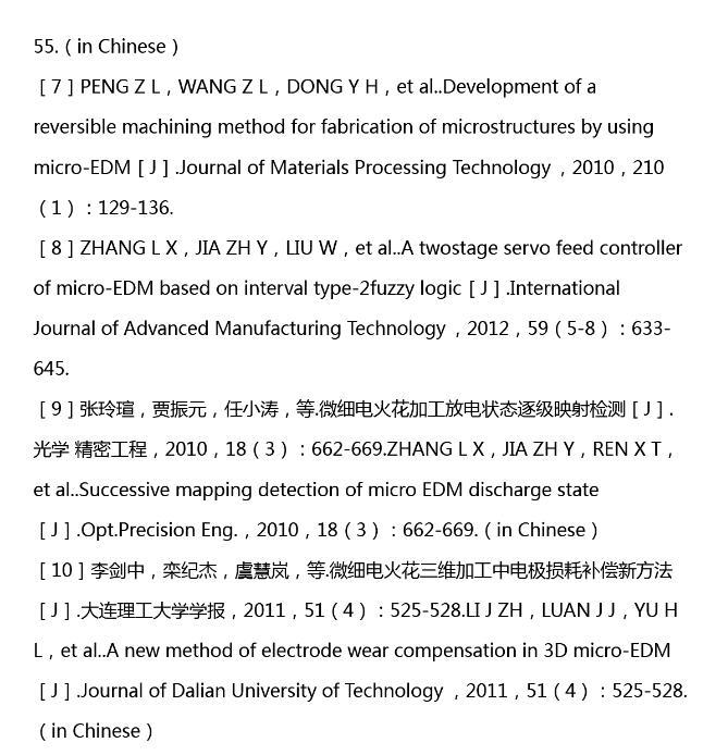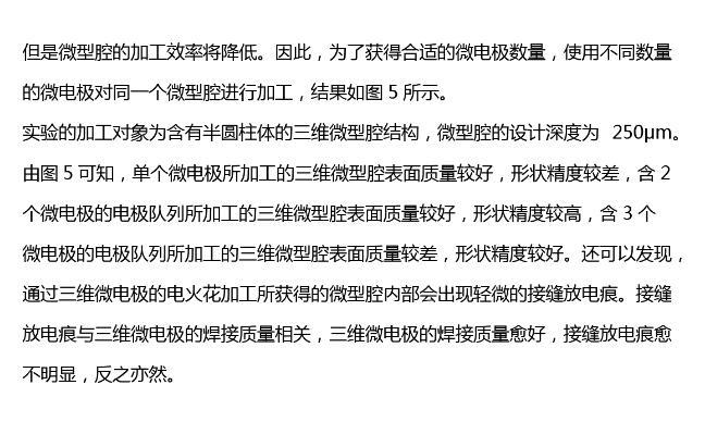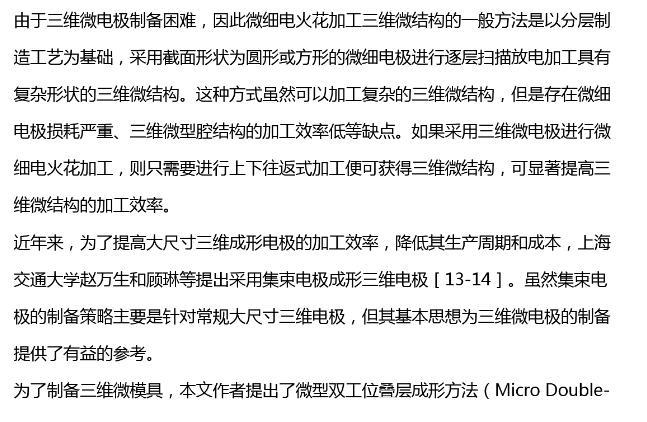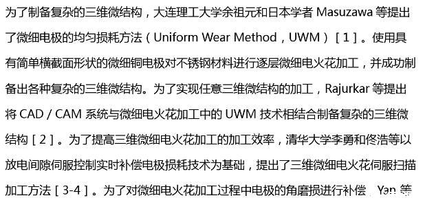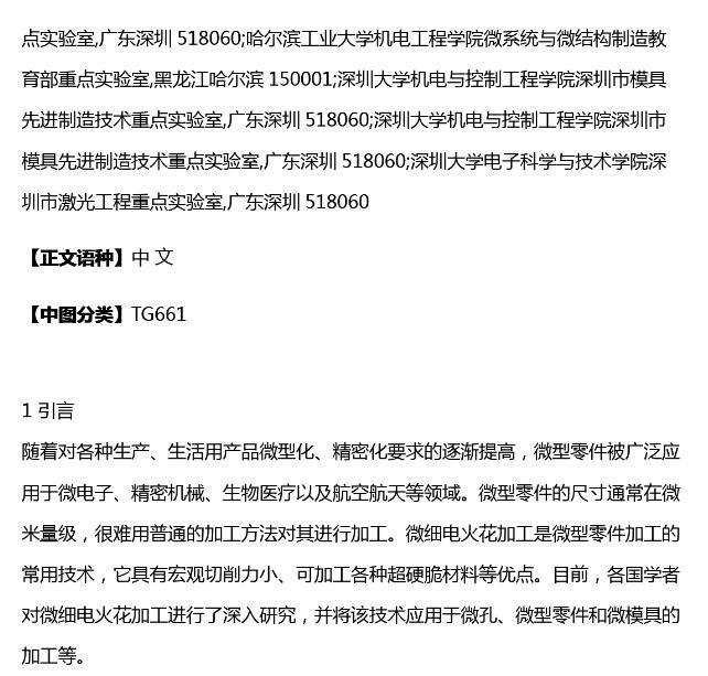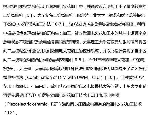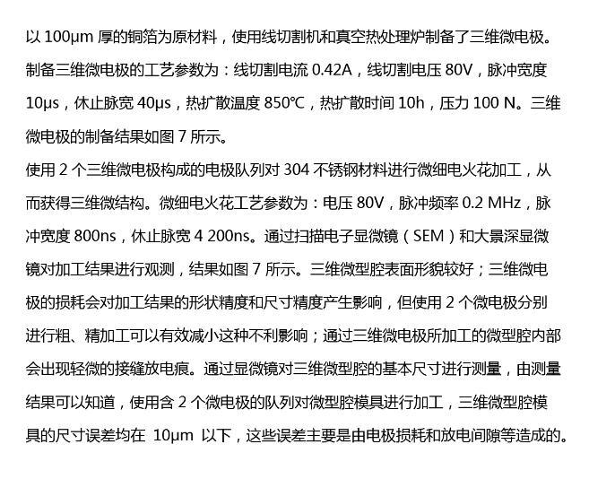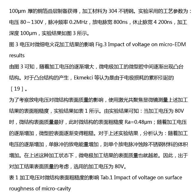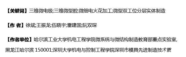 【摘要】:研究了三維微型腔模具的制備方法。該方法基于微型雙工位分層實體制造工藝(DLOM),通過多層銅箔二維微結構疊加擬合出三維隊列微電極,將制備的微電極用于微細電火花加工來制得三維微型腔模具。首先,利用線切割對100μm厚的多層銅箔進行逐層切割,獲得多層二維微結構。然后,通過真空壓力熱擴散焊對多層銅箔二維微結構進行連接,疊加擬合出三維隊列微電極。最后,在電壓80V,脈沖頻率0.2MHZ,脈沖寬度800ns,休止脈寬4 200ns的作用下,將上述工藝制備的三維隊列微電極用于微細電火花加工,獲得表面質量良好、形狀與尺寸精度較高的三維微型腔模具。為了有效減少電極損耗對加工精度的不利影響,使用隊列電極中的微電極依序對三維微型腔進行了加工。基于上述研究結果,制備了兩種形狀的三維隊列微電極并通過微細電火花加工獲得了表面粗糙度Ra為0.48μm的三維微型腔模具。與目前主流的微細電極逐層掃描放電加工三維微結構的工作方式相比,提出的三維微電極只需進行上下往返式加工便可獲得三維微型腔模具,工作效率高且損耗低。