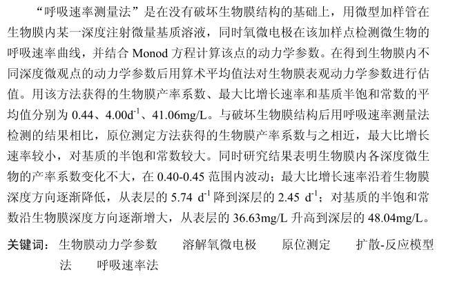 “呼吸速率測量法”是在沒有破壞生物膜結構的基礎上,用微型加樣管在生物膜內某一深度注射微量基質溶液,同時氧微電極在該加樣點檢測微生物的呼吸速率曲線,并結合Monod方程計算該點的動力學參數。在得到生物膜內不同深度微觀點的動力學參數后用算術平均值法對生物膜表觀動力學參數進行估值。用該方法獲得的生物膜產率系數、最大比增長速率和基質半飽和常數的平均值分別為0.44、4.00d~(-1)、41.06mg/L。