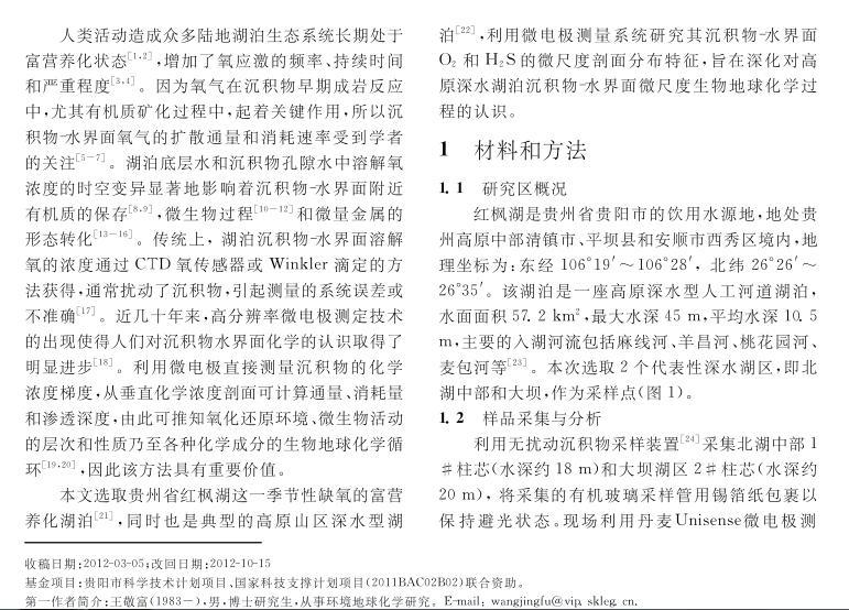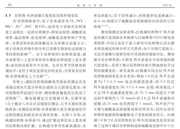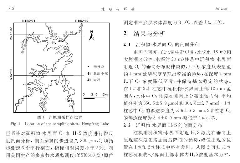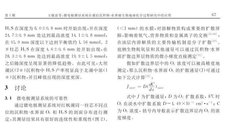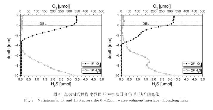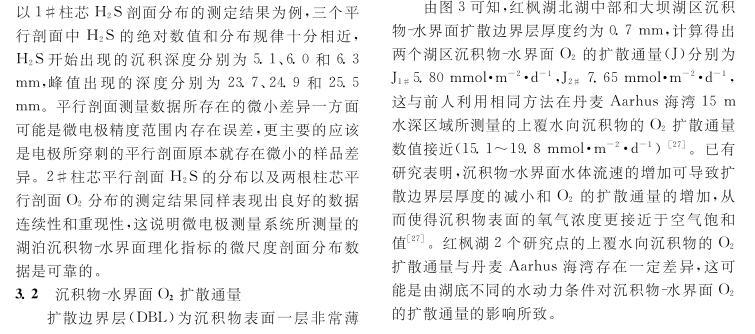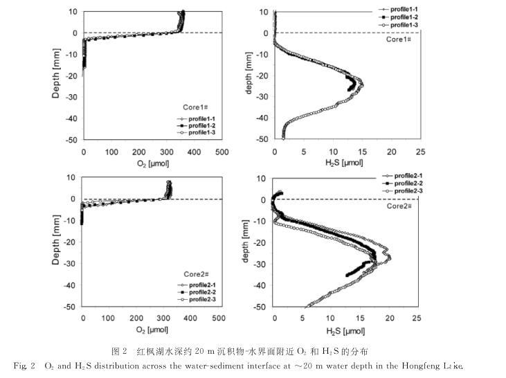 結果表明,紅楓湖北湖中部和大壩沉積物-水界面擴散邊界層厚度約為0.7mm,O2的擴散通量(J)分別為5.80和7.65mmol·m-2·d-1,O2的滲透深度分別為3.6±0.3mm和3.4±0.9mm,H2S的剖面變化主要受沉積物組成、O2消耗速率和硫酸鹽還原菌(SRB)分布的影響。