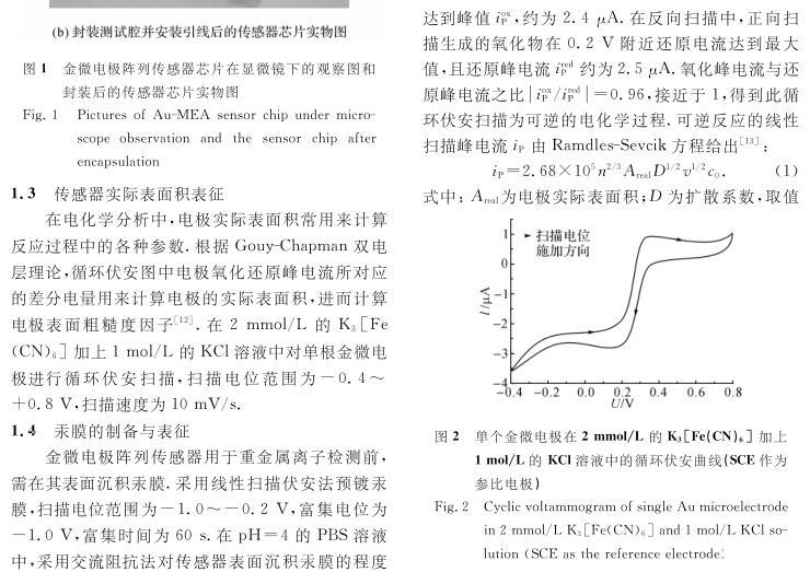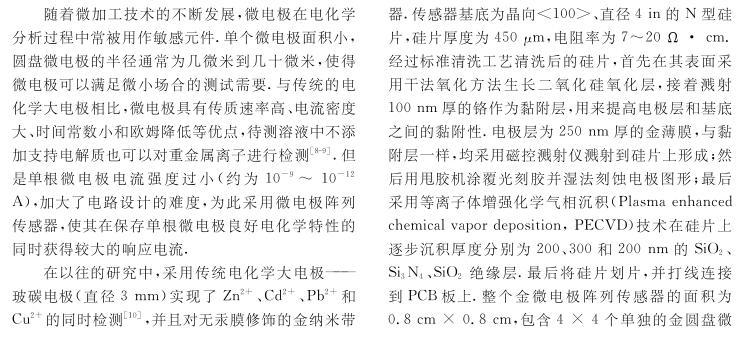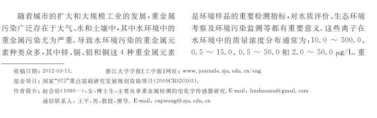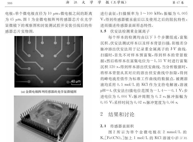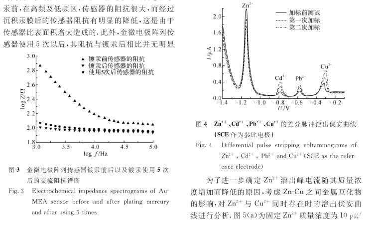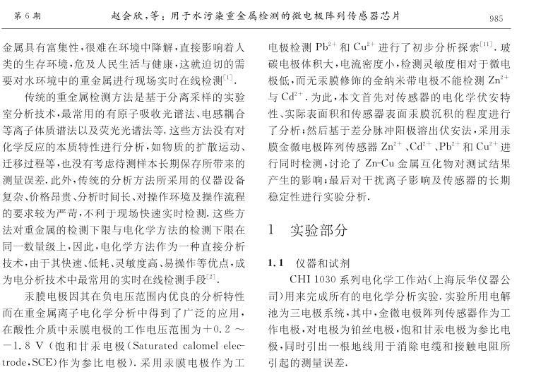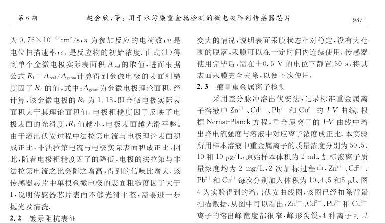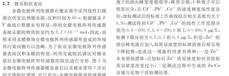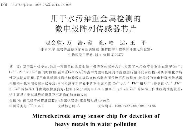 【摘要】:基于溶出伏安法,采用一種新型的汞膜金微電極陣列傳感器芯片,實現了水污染痕量重金屬離子Zn2+、Cd2+、Pb2+和Cu2+的同時檢測.在K3[Fe(CN)6]溶液中對微電極陣列傳感器進行循環伏安掃描,分析其電化學特性及實際表面積,采用電化學阻抗譜法檢驗微電極陣列傳感器表面汞膜沉積的程度。鍍汞后的微電極陣列傳感器采用差分脈沖陽極溶出伏安法,同時檢測樣本溶液中的重金屬元素:Zn2+、Cd2+、Pb2+和Cu2+,得到的Cd2+、Pb2+和Cu2+的標準工作曲線線性度良好,檢測下限分別為0.1、0.5和0.3μg/L,但Zn2+的標準工作曲線線性度較差,這主要是由測試基線的漂移及不準確的加標造成的。
