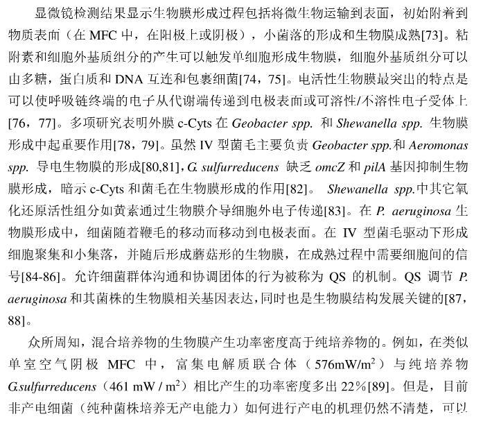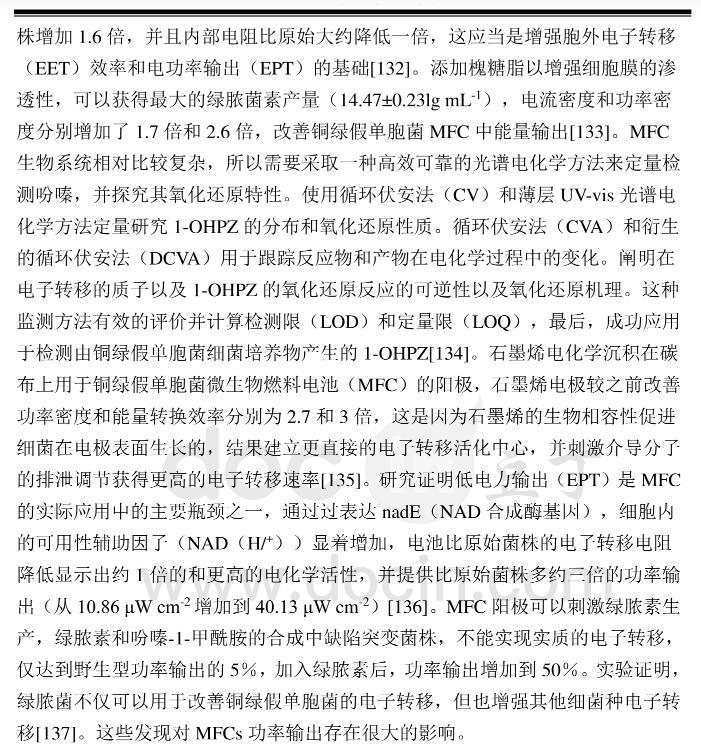 現(xiàn)階段,MFC的功率密度相對較低,這主要是由于細(xì)菌代謝導(dǎo)致的活化損失,尤其是低效的電子轉(zhuǎn)移比例(庫倫效率)和電子轉(zhuǎn)移速率(電流產(chǎn)量),因此而限制了其商業(yè)化應(yīng)用。就此而言,深入了解微生物胞外電子傳遞過程對微生物燃料電池的實(shí)施十分重要。在微生物燃料電池中,無論電子傳遞途徑如何,生物膜的形成對于電池產(chǎn)電效率具有至關(guān)重要的影響。目前,由于驗(yàn)證手段和方法的限制,微生物燃料電池陽極界面電子傳遞過程研究仍然相對滯后。對于生物膜在依賴自分泌電子介體所介導(dǎo)胞外電子傳遞中的作用尚不清楚。為了明確陽極界面電子傳遞機(jī)制,尤其是僅依賴自分泌介體進(jìn)行界面電子傳遞機(jī)制中陽極生物膜的作用,需要發(fā)展一種簡便易行的新方法對產(chǎn)電過程中陽極室內(nèi)的電子介體進(jìn)行實(shí)時(shí)分析,同時(shí)對生物膜形成與產(chǎn)電性能之間進(jìn)行系統(tǒng)研究和深入探討。