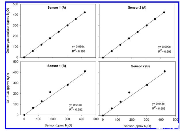 圖4、在25度環境下使用兩種不同方法測試廢水中的氧化亞氮,其中Sensor1A 2A表示的是采用了Unisense微電極系統測試氧化亞氮的氣體與傳統的在線分析氧化亞氮所測試的氧化亞氮氣體之間的線性相關系數,Sensor1B、2B表示的是采用了氣相色譜法測試氧化亞氮與微電極系統測試氧化亞氮氣體濃度之間的線性相關系數。從圖中對比可以看出,使用unisense微電級系統測試氧化亞氮與傳統的在線分析氧化亞氮測試的氧化亞氮氣體濃度的線性相關不錯,達到了0.999。