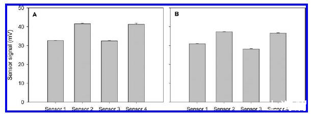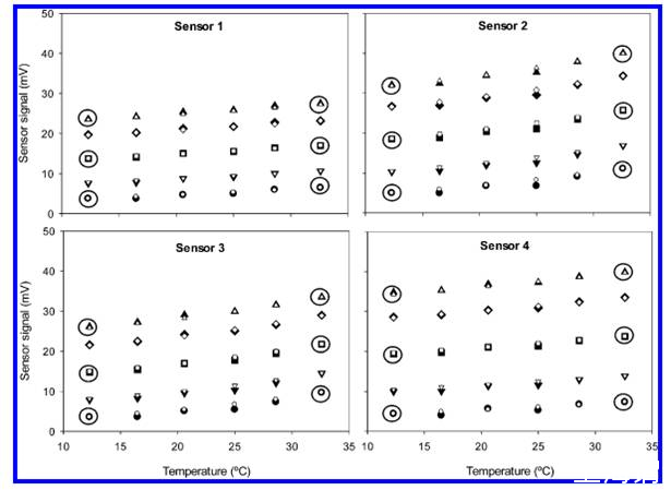 圖3、采用微電極法測試五種不同混合比例氣體中氧化亞氮濃度隨溫度(10-35度)的變化情況,其中sensor1、2、3、4指的是所采用的四根不同的電極。●(0pmv)▲(50.1ppmv)、▽(10.2ppmv)◇(40.3ppmv)■(25.5ppmv)。從圖中可以看出,隨著溫度的升高,測試氧化亞氮的電信號值呈線性的增加。