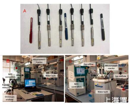圖1、微電極系統及其在污水處理中檢測氧化亞氮的應用。圖A指的是實驗中所使用的氧化亞氮微電極。圖B、C表示的是檢測污水中的氧化亞氮的實驗設置圖。