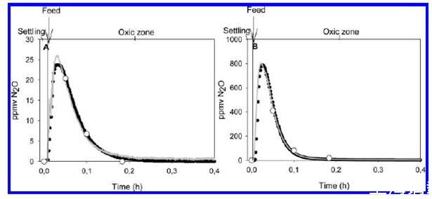 圖6、兩個不同的污水處理序列式反應器(SBR)中氧化亞氮的測試。其中圖A表示的是反應器中加的是亞硝酸鹽氧化細菌(NOB)、圖B指的是反應器中加的氨氧化細菌(AOB)。其中灰色線表示的是使用微電極系統法、黑色線表示的是商業化氣體分析法、白色圓圈表示的是氣相色譜分析法。