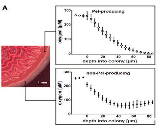 研究背景及結論:隨著生物膜的生長,常駐細胞不可避免地面臨著資源限制的挑戰。條件致病菌假單胞菌中銅綠假單胞菌PA14,電子受體的有效性影響基質的產生,從而影響生物膜的形態發生。分泌基質多糖Pel是形成薄膜和菌落起皺所必需的,這兩種活動會促進O2的獲得。利用菌落生物膜模型,發現了一種主要的影響銅綠假單胞菌PA14群落形態的因素為電子受體的可用性。隨著菌落的增加厚度、O2梯度的形成使群落呈現出不同的形態深度缺氧,導致細胞內減少增加。