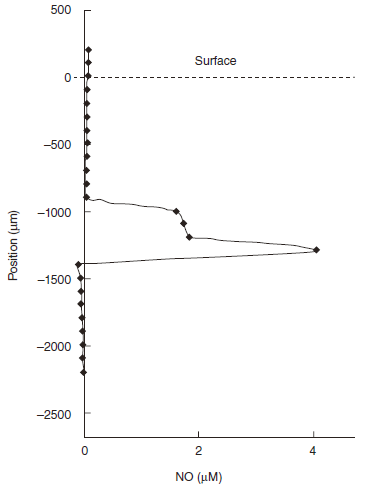 微電極的應用介紹:用unisense微剖面系統監測痰標本中的NO的剖面濃度。Unisense一氧化氮微電極(NO-100)結合使用馬達控制系統自動測試了肺感染患者痰液中的一氧化氮的垂直濃度剖面圖,使用自動馬達測試時,NO微電極移動步徑為100um。