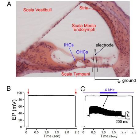 圖1記錄成年小鼠耳蝸EPFig.1 Recording EP from adult mouse cochleaeA:使用微電極通過耳蝸基底膜記錄內淋巴電位(EP)的示意圖。IHC:內毛細胞;OHCs:外毛細胞。B:從小鼠耳蝸底轉記錄到的內淋巴電位,紅色箭頭所指為電極插入、退出中階的時間點。C:從小鼠耳蝸底轉記錄到的內淋巴電位和胞外電位。在記錄內淋巴電位過程中,用4kHz的短純音誘發胞外電位(即耳蝸微音電位)。放大的胞外電位顯示在圖C的插圖中。
