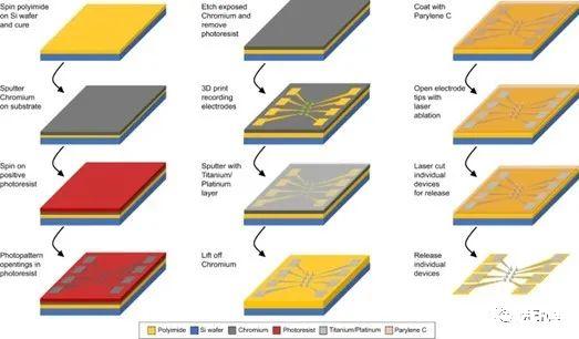 綜上所述,該研究提出的3D打印(雙光子激光直寫)電極陣列的制造方法具有良好的魯棒性,并且與標準硅和柔性聚酰亞胺器件制造工藝完全兼容。使用高分辨率的雙光子激光直寫工藝可以制造出仿生針式電極和多孔電極等在內的各種獨特的電極形狀。這些器件將實現以當前3D電極無法達到的空間分辨率進行神經記錄。利用雙光子激光直寫、激光燒蝕、光刻和濺射設備,該研究中介紹的制造方法可以廣泛應用于研究機構的科學研究中。此外,如果未來有基金或行業合作伙伴支持這項研究工作,那么該技術可以為神經科學和神經工程以及人體應用提供新的工具,例如在視覺假體或神經接口中需要小尺寸、高密度的神經記錄和刺激電極陣列。
