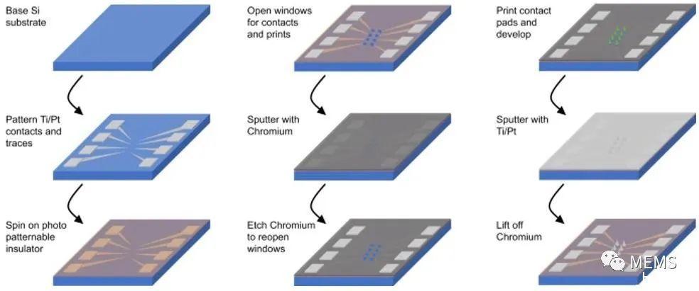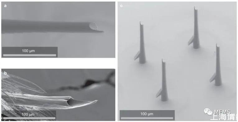 猶他陣列(Utah array)是目前應用最廣泛的3D電極陣列。該陣列的制造涉及硅片機械切割或劃片,因此需要剛性襯底,并且切割工具限制了電極之間的最小間距。因此,猶他陣列的尺寸較大,無法用于小動物(例如老鼠和鳴禽)的神經記錄。此外,猶他陣列具有相對較大的電極柄,這會導致異物組織反應,從而限制其長期記錄性能。3D打印電極為當前的電極設計提供了一種新的選擇。美國卡內基梅隆大學(Carnegie Mellon University)最近開發的器件展示了使用氣溶膠噴射保形打印方法3D打印針床電極的策略。然而,該策略雖然具有突破性,但該器件在氣溶膠噴射過程中受到低分辨率(10μm)的限制。