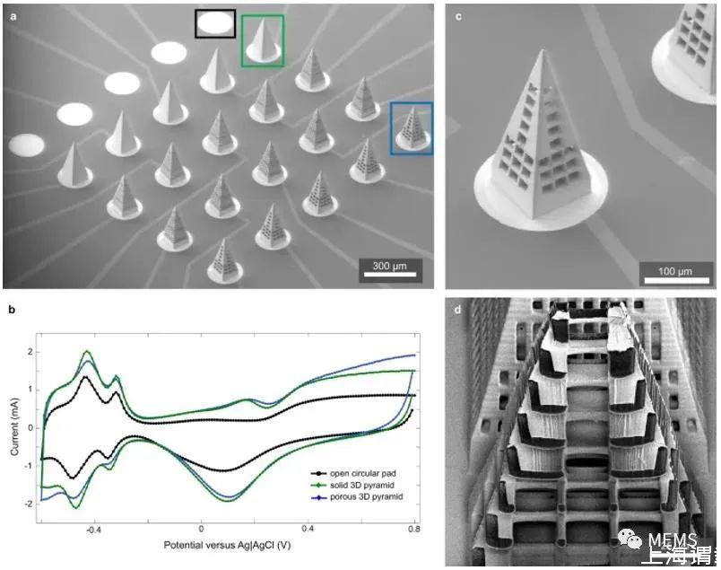 研究表明,3D和多孔刺激電極將有望為神經記錄帶來多種好處。在最簡單的層面上,3D刺激電極的突出表面將在電極和神經組織之間提供更好的電接觸,因此,在皮層腦電圖(ECoG)記錄和刺激以及周圍神經連接方面具有潛在的應用。此外,3D打印的大孔隙也可以增加電極的表面積,同時保持相同的總體移位組織體積。例如,圖4a中的實心金字塔的表面積為0.076平方毫米。相比之下,具有最小孔隙的金字塔的總表面積為0.391平方毫米,這使得刺激表面與組織之間的接觸增加了五倍。但是,由于組織的向內生長會導致孔內的接觸阻力增加,因此這種多孔性對于長期植入物的好處還有待于確定。