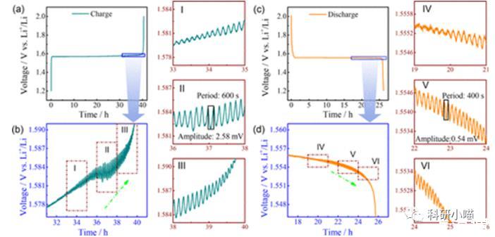 圖3.LTO單粒子微電極在15 nA電流下的恒電流充電(a,b)和放電(c,d)曲線的電化學(xué)振蕩及其放大圖。。