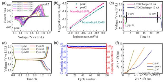 在充放電(GCD)測量中,單顆粒微電極設(shè)置10 nA的超低電流根據(jù)容量,其質(zhì)量負載估計在1μg左右。圖2d顯示了LTO單顆粒微電極在50 nA下的第1、20、40、60、80和100次GCD曲線,在50nA下循環(huán)100次后達到100%的庫侖效率和93.5%的容量保持率,且具有出色的長期循環(huán)穩(wěn)定性。