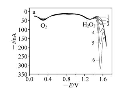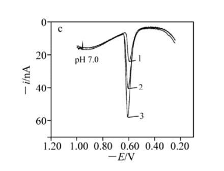 上圖是在溶解氧濃度為210微摩的海水中產生的方波伏安圖。氧在-0.28 V電位下被還原成過氧化物,過氧化物在-1.22 V電位下被進一步還原成水。兩個峰值電流的高度大致相等,這是汞金微電極在海水電解質中工作的特征。對稱的雙峰也表明了高質量的Hg-Au微電極