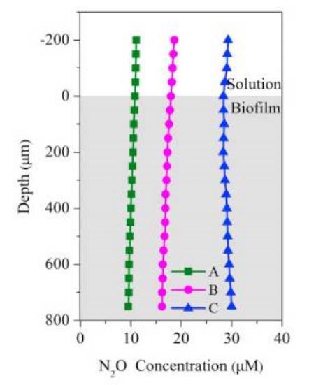 圖5、使用unisense氧化亞氮微電極分別在4h時后測試批處理的生物膜中的測試濃度微剖面圖。其中A,B,C對應的是不同批次的實驗。
