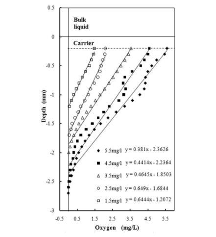 圖4、生物膜污水反應器中的含有不同溶氧濃度的污水中測試的生物膜中200um以下區域的氧濃度剖面分析圖,從圖中可以看出,生物膜污水反應器中溶解氧濃度不同,其生物膜中不同區域位置的溶液氧濃度呈現了一定的線性關系,并且在溶氧濃度為2.5mg/L時,其線性的斜率值最大。而反應器中污水中的溶液濃度差別引起生物膜中氧濃度差別是因為不同濃度的溶液氧在進入生物膜中的擴散速率也不一樣,從而影響了生物膜中的溶氧濃度。