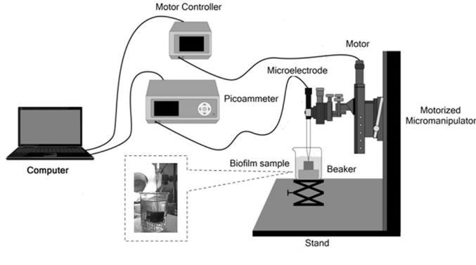 圖2、unisense微電極系統測試生物膜樣品的裝置圖。該套裝置主要包括電腦控制系統、馬達控制系統、數據采集系統三部分構成。其中數據采集系統是通過微電極、皮安表、電腦的軟件處理構成。