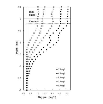圖3、污水反應器中的含有不同溶氧濃度的污水中測試的生物膜中的氧濃度剖面分布情況。(△(3.5mg/L)■(4.5mg/L)◆(5.5mg/L)□(1.5mg/L)○(2.5mg/L))。從圖中可以看出,當污水體系中溶氧濃度越高,其對于反應器中生物膜中的溶氧濃度也越高。當測試到生物膜中2mm以下的區域時,生物膜中的溶氧濃度變化較小,并逐漸降至0。并且不同溶氧濃度(1.5mg/L~5.5mg/L)的反應器中對應的生物膜中氧氣濃度為零所對應的距離也不同,分別為1.2mm、1.7mm、2.0mm、2.5mm、2.6mm。