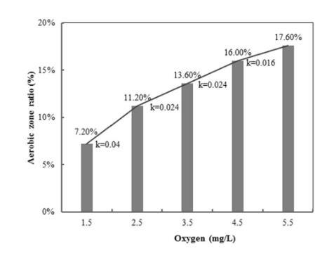 圖5、生物膜反應器中通入不同濃度溶解氧時,反應器中對于的生物膜中溶解氧(DO濃度大于0.32mg/L的區域百分比。從圖中可以看出,反應器中溶氧濃度為5.5mg/L,生物膜中DO濃度大于0.32mg/L的有氧區域最多,其百分比達到17.6%,并且會隨著生物膜反應器中DO濃度降低其對應的區域百分比也降低,低至7.2%。