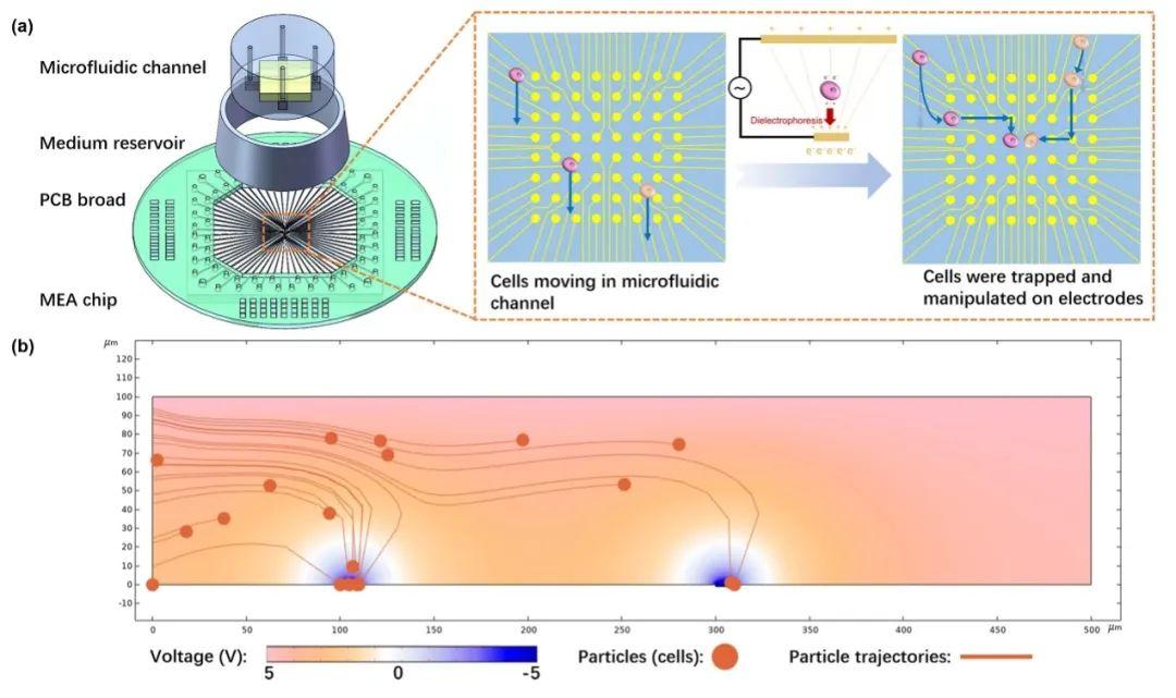 圖1.細胞操控裝置及原理:(a)裝置示意圖,主要包括具有微流控結構的MEA芯片。細胞被捕獲并在電極之間轉移以實現精確的操控;(b)細胞捕獲過程的模擬結果。細胞從左側釋放,以10μm/s的流速移動。隨后,電極利用介電泳力將細胞捕獲。