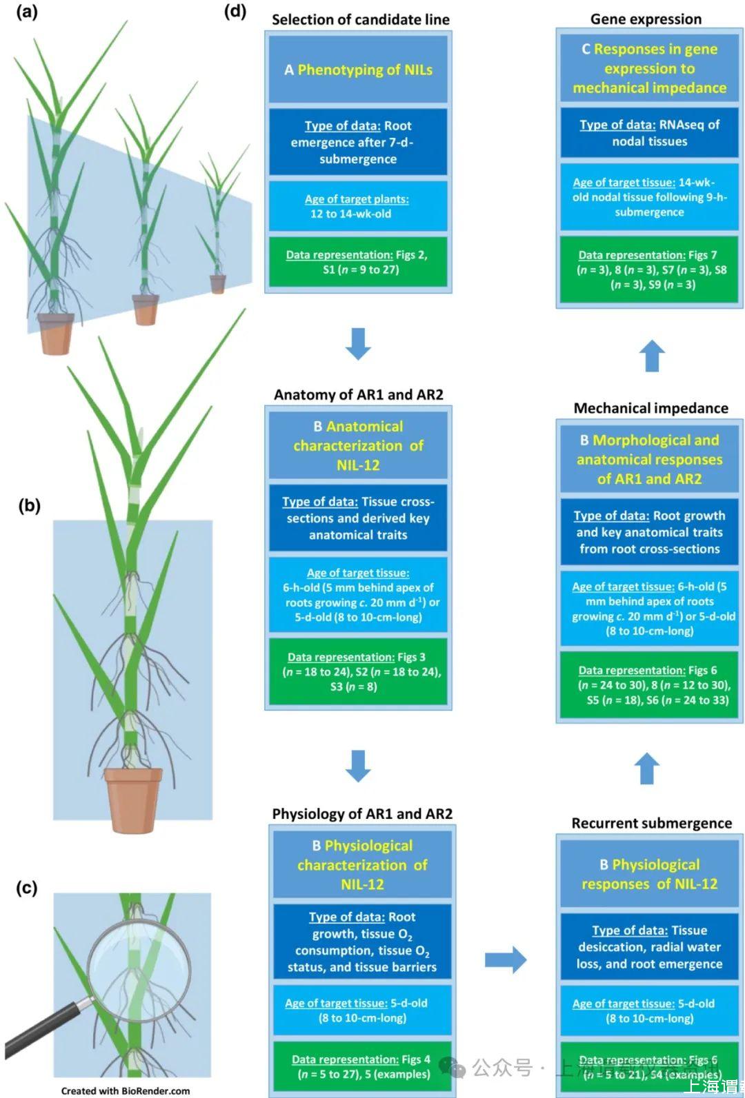 圖1、展示實驗條件和子實驗相互關系的概念圖。(a)不定根形成的表型作為對部分淹沒的反應和目標基因型的選擇。(b)nil12的解剖和生理特征。(c)基因表達對存在或不存在機械阻抗的響應。(d)數據類型、目標組織和數據表示。AR=不定根;NIL=近等基因系。