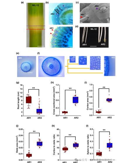 圖3、水稻(Oryza sativa)的NIL-12株在其節點上產生兩種不同的AR類型。(a)NIL-12莖節,用虛線紫色和紅線表示不定根發展的兩個位置。(b)(a)所示位置的節點截面。在較低位置發育的不定根稱為不定根1,在被葉鞘覆蓋的節點上部發育的不定根稱為不定根2。(c)顯示AR1和AR2的掃描電子顯微照片。Bar,300μm。(d)有代表性的AR1和AR2伸長。棒,5毫米。(e)從NIL-12的第4年輕節的AR1和AR2的橫切面在根尖后5mm切除,用甲苯胺藍染色。(f)AR2顯示氣管元件(TE)、中心柱體(CC)、皮層(Co)和外細胞層(OCL)。橫切面取根尖后5mm。棒材,0.2 mm。(g-l)測定了NIL-12植株第4幼節AR1和AR2的平均長度、橫截面積、皮層面積、中柱面積或木質部/中柱比。AR-不定根;NIL-近等基因系。