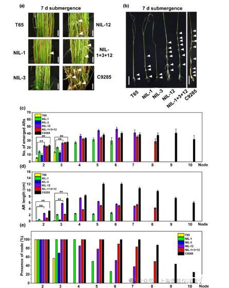 圖2、深水水稻(Oryza sativa L.)QTL1和QTL12在水稻背景T65中促進不定根的形成。(a)T65、NIL-1、NIL-3、NIL-12、NIL-1+3+12和深水水稻C9285部分淹水7天。(b)去除葉片的代表性莖顯示出不定根生長的節點(白色箭頭)的位置。(c)T65、NIL-1、NIL-3、NIL-12、NIL-1+3+12和C9285浸水7天植株各節點(節點1為最年輕、最上面的節點)上出現的ar平均數量。(d)在指示節點上生長的ARs的平均長度由三個獨立的實驗確定。(e)T65、NIL-1、NIL-3、NIL-12、NIL-1+3+12和C9285浸水7天植株均有淋巴結。低地水稻T65有2-3個節,深水水稻C9285有10個節。AR=不定根;NIL=近等基因系。QTL=數量性狀位點。