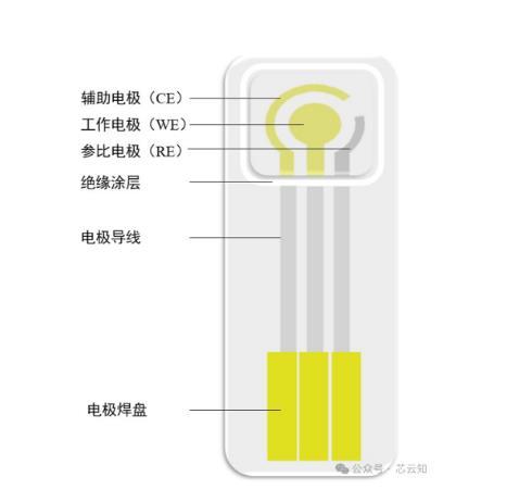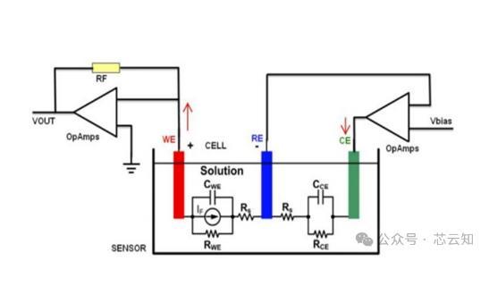 對三電極檢測葡萄糖進行原理說明,溶液中的葡萄糖被電極表面固化的酶還原產(chǎn)生過氧化氫,對工作電極施加電壓,電離過氧化氫產(chǎn)生氫離子,促進電流從工作電極流出。此時電流大小與電離產(chǎn)生的電子量成正相關(guān),反應(yīng)速率決定電流大小從而得到血糖濃度。控制回路由WE和RE組成,維持施加在工作電極上的電壓恒定,且回路中不包含極化電流,不影響極化狀態(tài)和系統(tǒng)的穩(wěn)定性。CE和WE經(jīng)溶液中形成極化回路,P為極化電源。