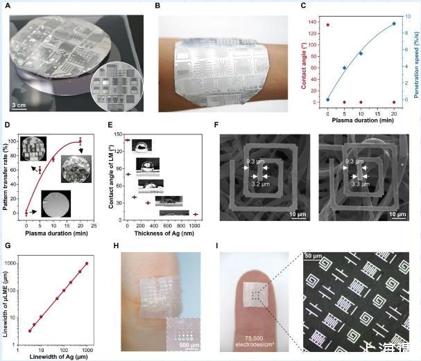 圖2:μLMEs結(jié)構(gòu)示意圖。(A)銀微圖案從晶圓轉(zhuǎn)移到SBS纖維墊的圖像。插圖為轉(zhuǎn)移之前在晶圓上的圖案。(B)附著在人體手臂上的μLMEs的圖像(液態(tài)金屬負(fù)載量:10 mg/cm2)。(C)溶劑對(duì)犧牲層的接觸角和滲透速度以及(D)圖案轉(zhuǎn)移成功率與等離子體處理時(shí)間的函數(shù)。(E)LM在轉(zhuǎn)移銀層上的接觸角隨銀厚度的變化。(F)選擇性潤(rùn)濕前后SBS纖維墊上電極的掃描電鏡圖像。(G)μLMEs的線寬與Ag電極的原始線寬的對(duì)應(yīng)關(guān)系。(H,I)μLMEs高密度陣列的,陣列密度高達(dá)75500電極/cm2。