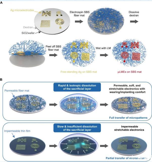 圖1:可拉伸和可滲透的液態(tài)金屬微電極(μLMEs)的制備過(guò)程。(A)μLMES制造過(guò)程的示意圖。(B)比較使用可滲透的纖維墊或不可滲透的薄膜對(duì)犧牲層的不同溶解過(guò)程影響示意圖。