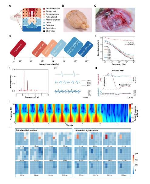 圖4:基于高密度μLMEs的神經(jīng)電生理界面生物電子學(xué)表征。(A)基于μLMEs的ECoG陣列的示意圖和記錄的皮質(zhì)子域。(B,C)μLME ECoG電極陣列(厚度25μm)在柔軟、彎曲和復(fù)雜的大腦皮層上適形附著的數(shù)字圖像。虛線表示μLME陣列的邊界。(D)μLMEs的楊氏模量與已經(jīng)報(bào)道的ECoG生物電極材料的比較。(E)不同應(yīng)變下μLMEs和Au/PI電極的體外電化學(xué)阻抗譜(EIS)表征。(F)活體大鼠睡眠狀態(tài)下體內(nèi)神經(jīng)信號(hào)的功率譜分析。(G)用μLMEs記錄不同頻率脈沖電壓電刺激下的體感誘發(fā)電位(SEPs)。(H)不同強(qiáng)度脈沖電壓電刺激下對(duì)側(cè)和同側(cè)體感覺(jué)皮質(zhì)電位的比較。(I)對(duì)側(cè)體感覺(jué)皮層在10次強(qiáng)度為6 V、頻率為1 Hz的連續(xù)電刺激下的信號(hào)譜圖。(J)左右前肢電刺激下μLME陣列的時(shí)空特性研究。