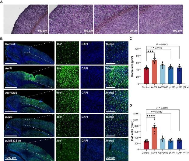 圖5:μLMEs用于慢性神經(jīng)植入物的慢性(長(zhǎng)期)生物相容性表征。(A)電極陣列植入2小時(shí)后染色腦切片的免疫組織學(xué)分析。(B)對(duì)照植入后2周,Au/PI電極、Au/PDMS電極、μLME電極和μLME電極,植入時(shí)間為32周(32w),免疫組化染色小膠質(zhì)細(xì)胞(Iba1,綠色)和細(xì)胞核[4′,6-二氨基-2-苯基吲哚(DAPI),藍(lán)色]。左圖為低放大圖(比例尺=1000μm),右圖為高放大圖(比例尺=200μm)。(C)小膠質(zhì)細(xì)胞胞體大小的統(tǒng)計(jì)分析(n=6)。Au/PI組(P=0.0002)和Au/PDMS組(P=0.0375)的小膠質(zhì)細(xì)胞胞體大小與對(duì)照組相比顯著增加(雙向,非配對(duì)Student's t檢驗(yàn))。μLME組與對(duì)照組之間差異無(wú)統(tǒng)計(jì)學(xué)意義(植入后2周P=0.4482,植入后32周P=0.6143)。(D)總小膠質(zhì)細(xì)胞數(shù)量的統(tǒng)計(jì)分析(n=6)。與對(duì)照組(雙向,未配對(duì)的學(xué)生t檢驗(yàn))相比,在AU/PI組(P<0.0001)和AU/PDMS組(P=0.0274)中發(fā)現(xiàn)了IBA1細(xì)胞的顯著增加。μLME組和對(duì)照組之間沒(méi)有發(fā)現(xiàn)顯著差異(植入后2周時(shí)P=0.3912,在植入后32周時(shí)P=0.2566)。