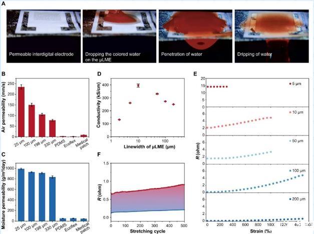 圖3:μLMEs的滲透性、導(dǎo)電性和拉伸性表征。(A)一個(gè)彩色水滴從μLMEs的一側(cè)滲透到另一側(cè)光學(xué)圖像。(B,C)μLMEs在不同厚度SBS纖維墊上以及其他生物電子學(xué)常用襯底,包括PDMS,Ecoflex和醫(yī)療貼片上的透氣性和透濕性表征。(D)不同線寬下μLMEs的電導(dǎo)率變化。(E)不同線寬μLMEs在不同拉伸應(yīng)變下的電阻。(F)在1000%的大拉伸應(yīng)變下μLMEs(線寬50μm)的循環(huán)電穩(wěn)定性。