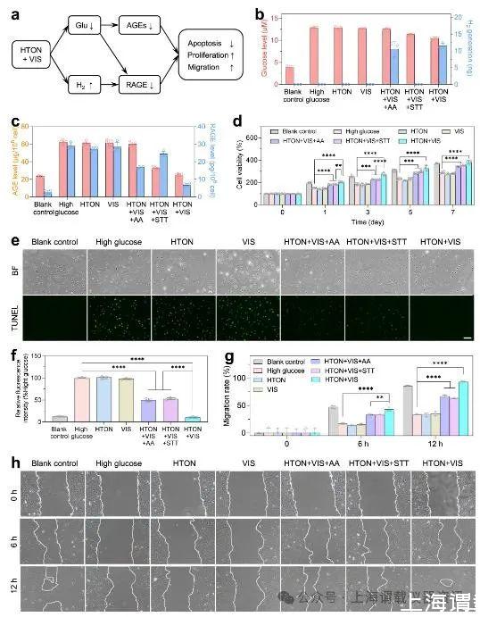 在模擬溶液中,使用氫氣微電極(Unisense,丹麥)檢測氙燈照射下在HTON上VIS光催化生成的氫。在葡萄糖溶液(20 mM)中加入HTON制備模擬高糖環境,最終HTON濃度設置為200μg/mL。將1ml配制好的溶液放入一個特殊的容器中,然后將氫氣微電極(unisense)置于溶液上方,通過在黑暗中固定時間點照射溶液的氙燈反復開關來檢測氫分子。收集的溶液稀釋10倍后,使用葡萄糖測定試劑盒(Solarbio,BC2505)測定相應時間點的葡萄糖濃度。在體外,收集細胞上清檢測VIS照射后的氫氣的濃度,同時過濾細胞上清去除納米顆粒,然后使用葡萄糖檢測試劑盒檢測葡萄糖濃度。